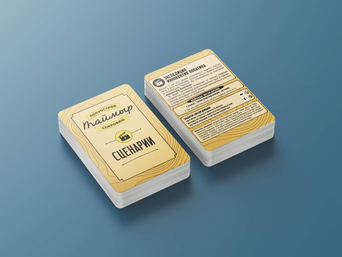 В игре «Таймыр. Полуостров сокровищ» - есть два игровых сценария. В первом игроки соревнуются между собой, кто соберет больше полезных ископаемых. Они исследуют карту, находят неожиданные артефакты вроде бивней мамонта и выполняют задания колоды «Событие»: там бывают сюрпризы – как позитивные, так и не очень. Во втором сценарии все игроки становятся участниками одной из великих исторических экспедиций, проходивших на полуострове в начале XX века, и сражаются против самой игры. Здесь можно примерить на себя роль полярного лётчика, биолога, метеоролога и многих других. Полярный день длинен, но и он подходит к концу. В обоих сценариях игрокам надо рассчитать силы так, чтобы успеть выполнить все задания, пока солнце не село за горизонт.
