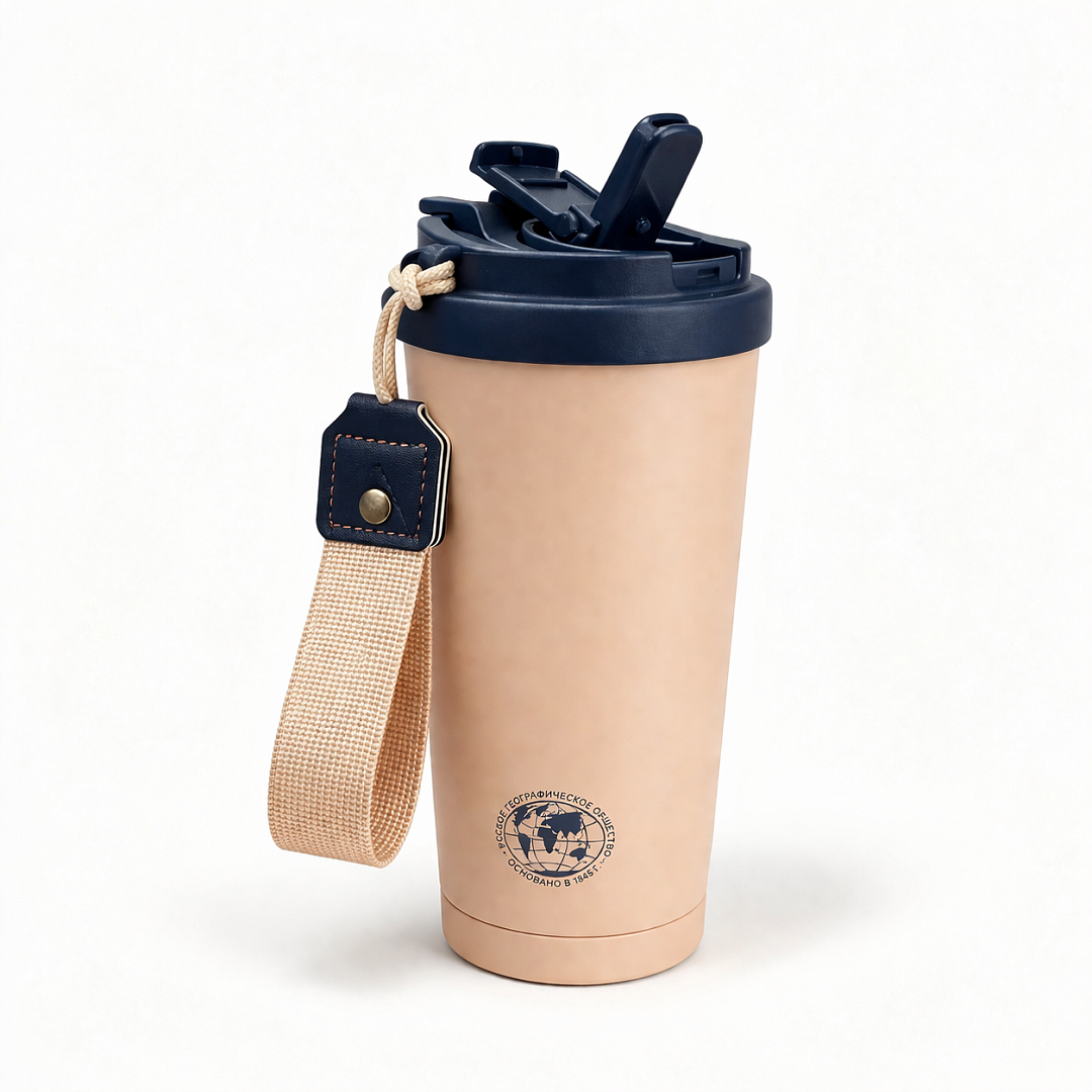 Стильная термокружка классической формы с логотипом РГО — удобное решение для тех, кто любит брать кофе или сезонные напитки с собой. Она комфортно лежит в руке, оснащена практичным ремешком для дополнительного контроля и легко помещается в стандартные подстаканники.