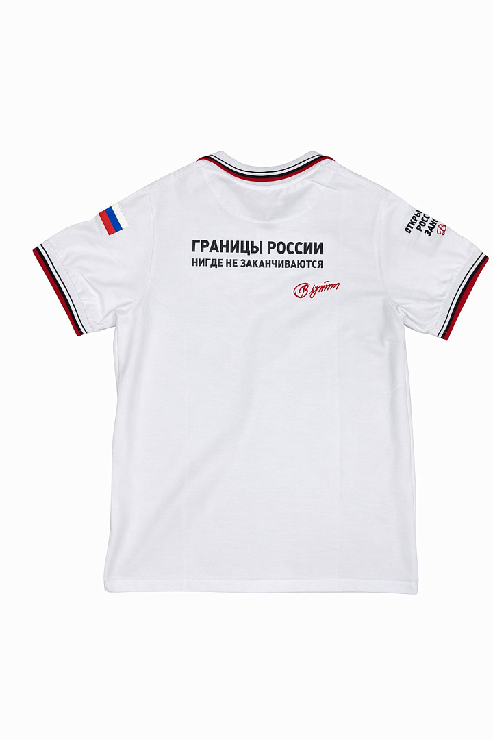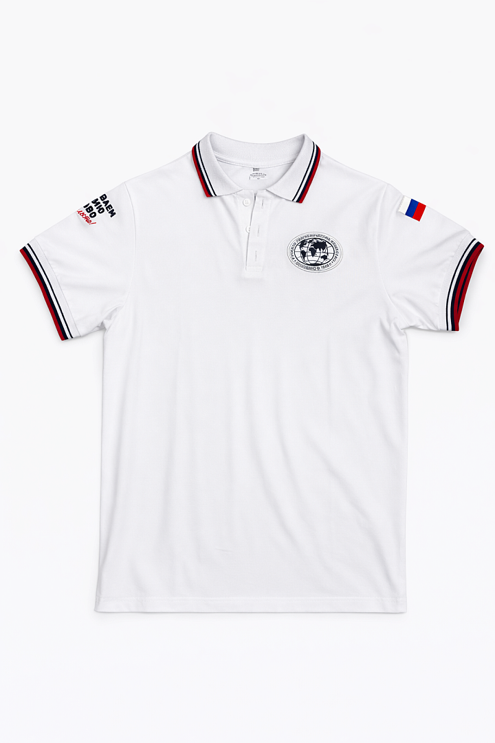 Белое поло из плотного хлопка с классическим кроем и воротником на пуговицах. Модель украшена вышивкой логотипа РГО на груди, шевроном с флагом России и контрастной отделкой в цветах триколора.