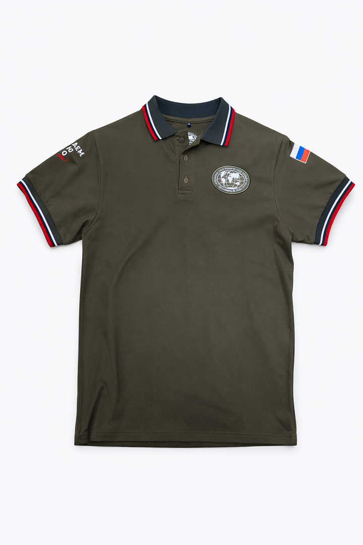 Поло цвета хаки из плотного хлопка с классическим кроем и воротником на пуговицах. Модель украшена вышивкой логотипа РГО на груди, шевроном с флагом России и контрастной отделкой в цветах триколора.