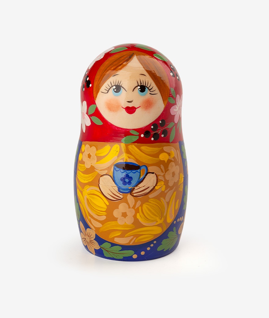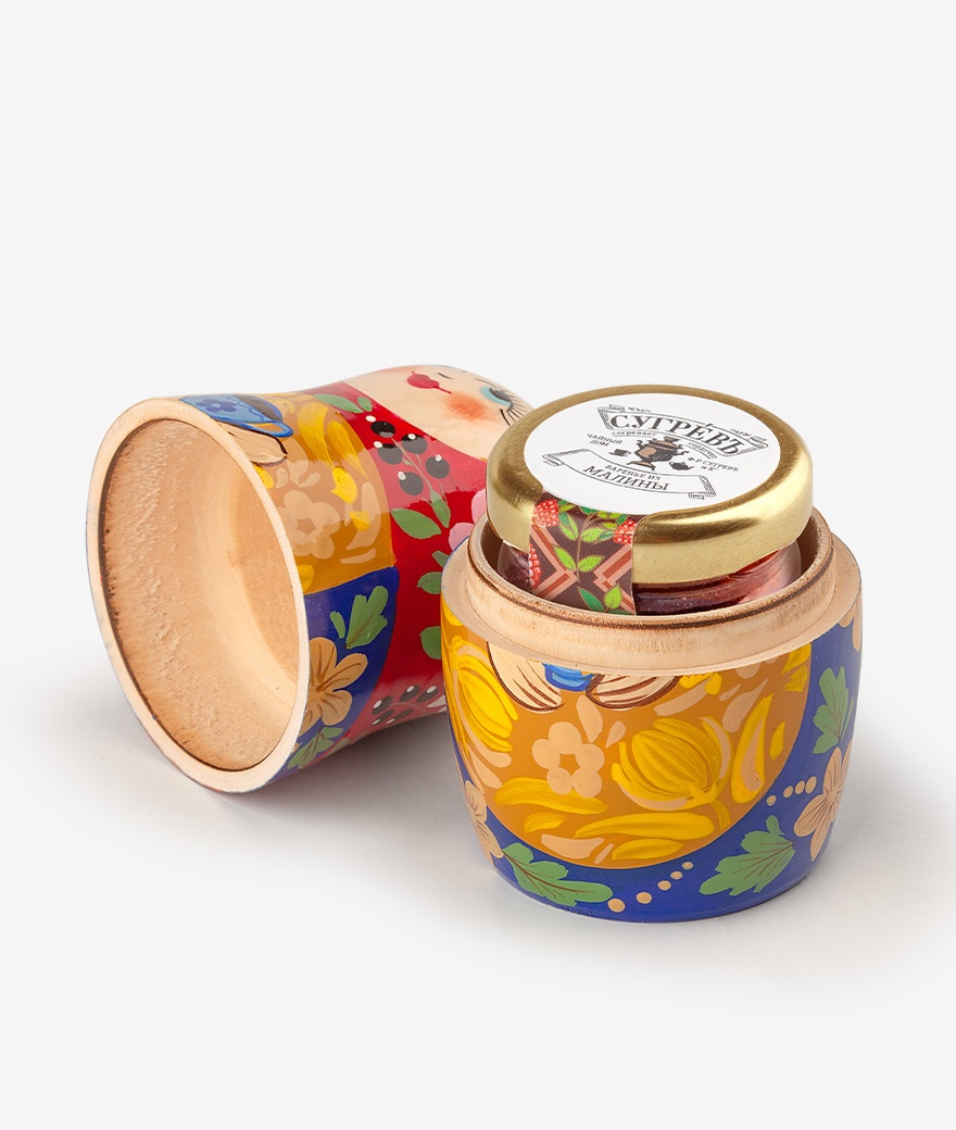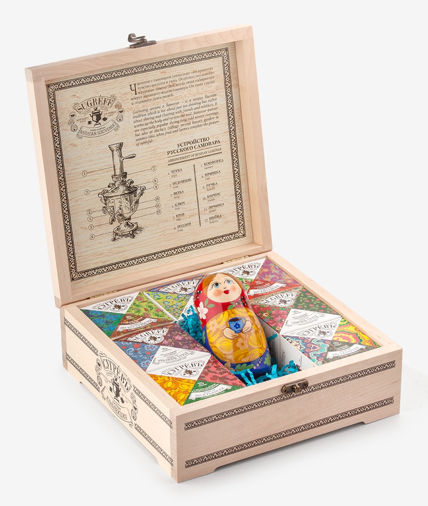 Подарочный набор из семи эксклюзивных купажей листового чая, характерных для разных регионов России и матрешки ручной работы с натуральным вареньем из малины , в сувенирной шкатулке из массива берёзы. Содержит подробную схему устройства русского самовара на русском и английском языках.